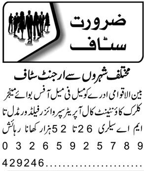 Private Organization Lahore, lahore Punjab Pakistan invites applications from eligible candidates for the post of office boy, accountant, field worker, call operator, clerk, supervisor and manager as per advertisement of December 29, 2023 published in daily Roznama 92 News Newspaper. Candidates with Master, Bachelor, Intermediate, Matric and Middle etc. educational background will be preferred.