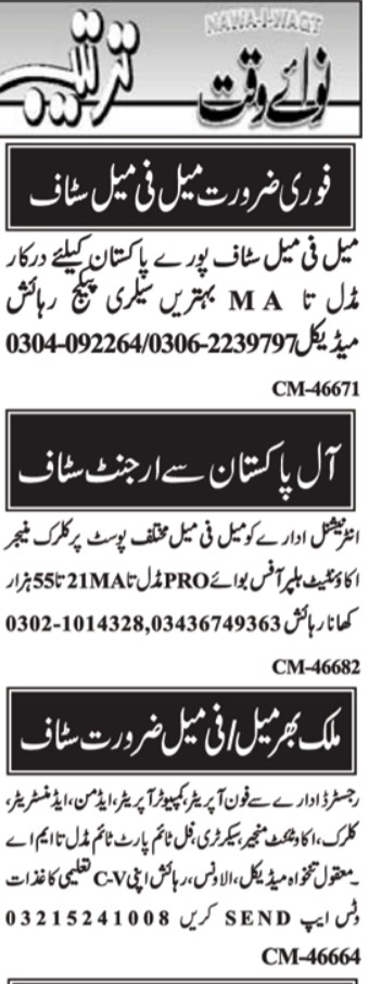 Private Company jobs advertisement dated about 14 June 2022 in daily Nawaiwaqt Newspaper invites application for the vacant post of call operator, driver, manager, clerk, plumber, assistant manager, watchman, supervisor, accountant, security guard, sipahi, sweet maker, computer operator, telephone operator, store keeper, office boy, field worker and office secretary in Islamabad, islamabad Islamabad Pakistan. Bachelor, Intermediate, Middle, Master and Matric etc. educational qualification will be preferred.