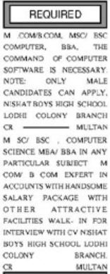 Nishat Boys High School invites applications for job positions advertised in daily Khabrain dated 1 April 2023 for following vacancies in Multan, multan Punjab Pakistan.