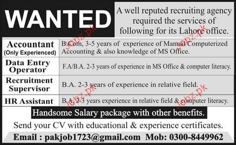 Accountant, Data Entry Operators, Recruitment Supervisors and HR Assistants are required in Lahore.