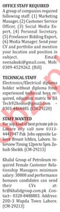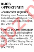 Female Client Relation Officer, Imports & Marketing Executive, Purchase Assistant, Quantity Surveyor, Office Assistant, Lab Assistant, Manager, Admin Manager, Accountant, , MBBS Medical Officer, Radiologist, Staff Nurse, LHV, Doctor, Lady Doctor, Technicians, Pharmacist, Midwives, Gynecologist, Relationship Officer, Pharma, Sales Representative, Sales & Marketing Manager, Sales Coordinator, Clerk, Security Guards and LTV Driver required in well reputed companies.