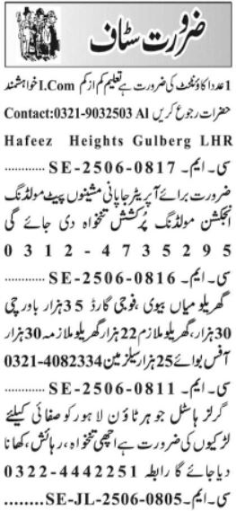 Private Company invites applications for job positions advertised in daily Jang dated 1 July 2025 for following vacancies in Gulberg Lahore, lahore Punjab Pakistan.