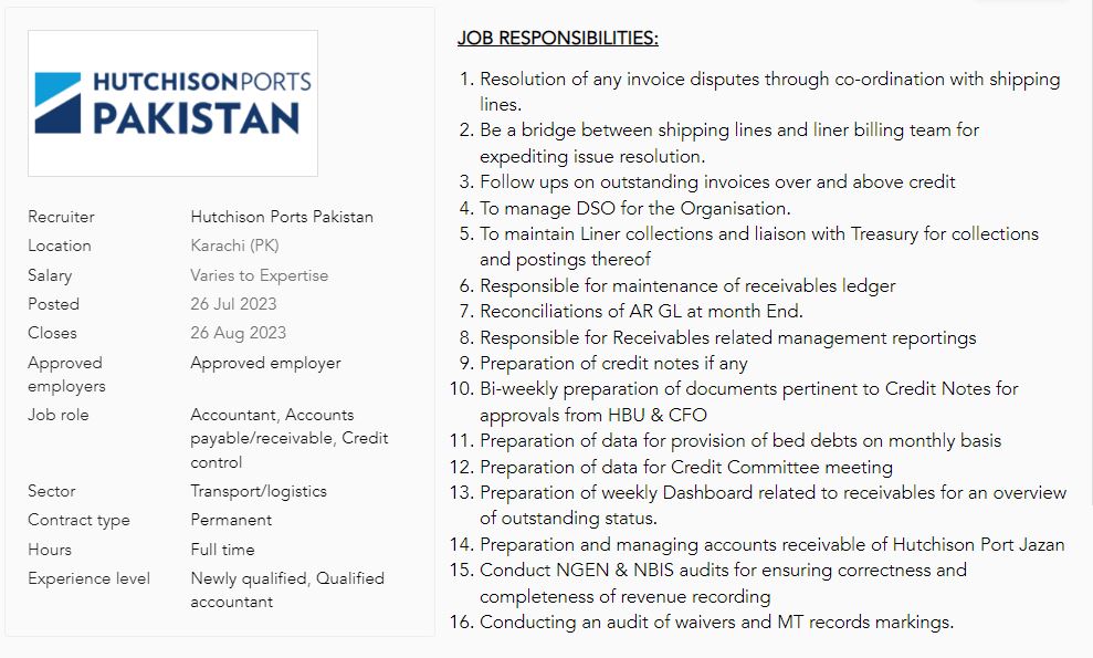 Hutchison Ports Pakistan jobs advertisement dated about 4 August 2023 in daily Other Newspaper invites application for the vacant post of accountant in Karachi, karachi Sindh Pakistan. Persons with Master and Bachelor etc. education can apply.