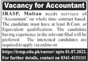 Vacant posts including accountant are announced in Institute of Research and Advanced Studies of Multan, multan Punjab Pakistan as per 26 June 2022 advertisement in daily Jang Newspaper. Candidates with B.com and Bachelor etc. educational background will be preferred.