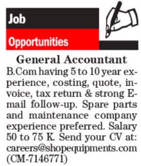 Apply at Private Company latest Classifieds jobs in Accounting and departments before closing date which is around June 19, 2024 or as per closing date in newspaper ad. Read complete ad online to know how to apply on latest Private Company job opportunities.