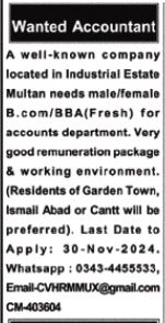 Private Company jobs advertisement dated about 16 November 2024 in daily Nawaiwaqt Newspaper invites application for the vacant post of accountant and female accountant in Multan, multan Punjab Pakistan. BBA, Bachelor and B.com etc. educational qualification will be preferred.