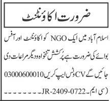 NGO jobs advertisement dated about 25 September 2024 in daily Jang Newspaper invites application for the vacant post of office boy and accountant in Islamabad, islamabad Islamabad Pakistan. Educational qualifications required Master and Bachelor etc.