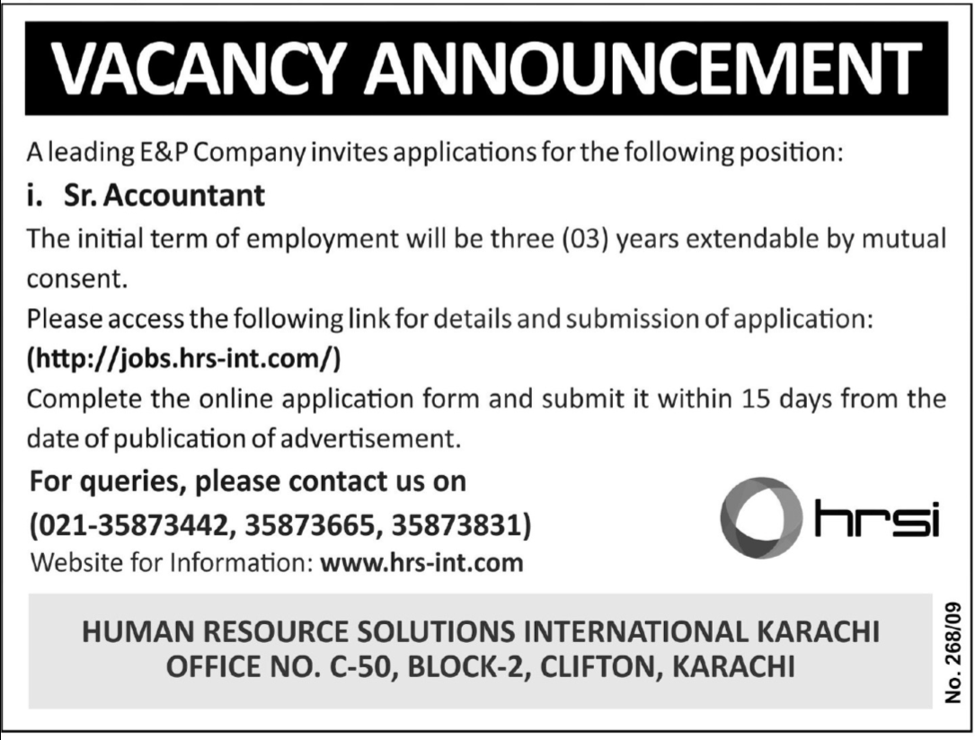 Human Resource Solutions International HRSI Karachi, karachi Sindh Pakistan invites applications from eligible candidates for the post of accountant as per advertisement of November 9, 2025 published in daily Express Tribune Newspaper. Candidates with Bachelor and Master etc. educational background will be preferred.