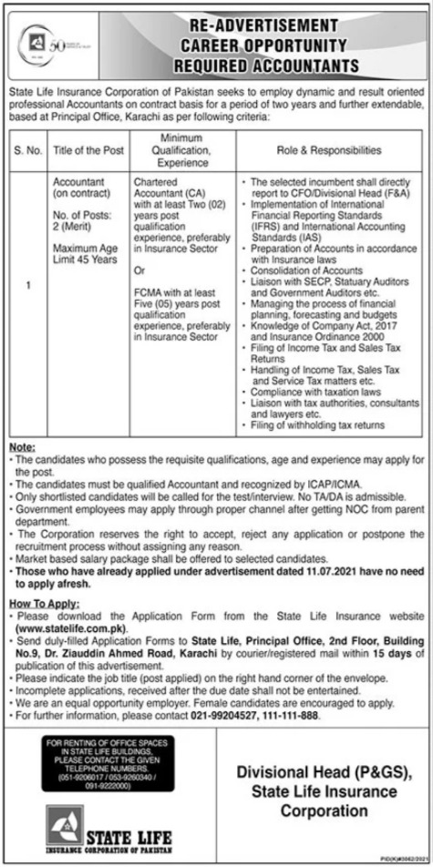 Accountant Jobs In State Life Insurance Corporation Of Pak