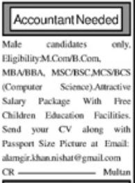 Vacant posts including accountant and accounts officer are announced in Accountancy Firm Multan, multan Punjab Pakistan as per 5 February 2025 advertisement in daily Khabrain Newspaper. Educational qualifications required BBA, M.sc, B.com, MCS, M.com, BCS and MBA etc.