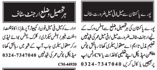Private Company Islamabad, islamabad Islamabad Pakistan invites applications from eligible candidates for the post of telephone operator, office staff, office boy, secretary, computer operator, clerk, accountant, assistant manager, lady worker and office secretary as per advertisement of April 9, 2022 published in daily Nawaiwaqt Newspaper. Educational qualifications required Matric, Middle, Bachelor and Intermediate etc.
