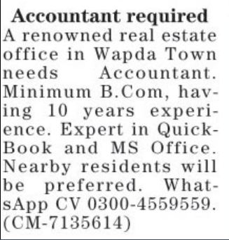 Vacant posts including accountant are announced in Real Estate Lahore, lahore Punjab Pakistan as per 31 July 2023 advertisement in daily The News Newspaper. Preferred Education is B.com etc.