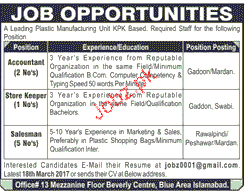 Accountant, Store Keepers and Salesmen Job Opportunity