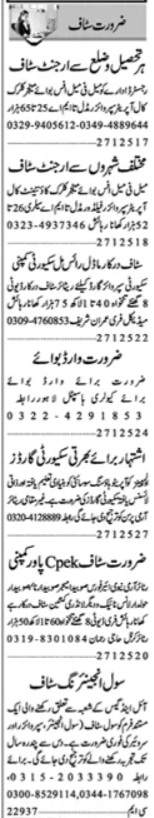 Private Company Lahore, lahore Punjab Pakistan invites applications from eligible candidates for the post of driver, havaldar, subedar, laundry canteen staff, lance naik, civil engineer, office boy, accountant, supervisor, subedar major, manager, security supervisor guard, field worker, surveyor, naib subedar, security guard, clerk and call operator as per advertisement of January 28, 2025 published in daily Dunya Newspaper. Persons with BA, B.com, Bachelor, Matric, Middle and Intermediate etc. education can apply.