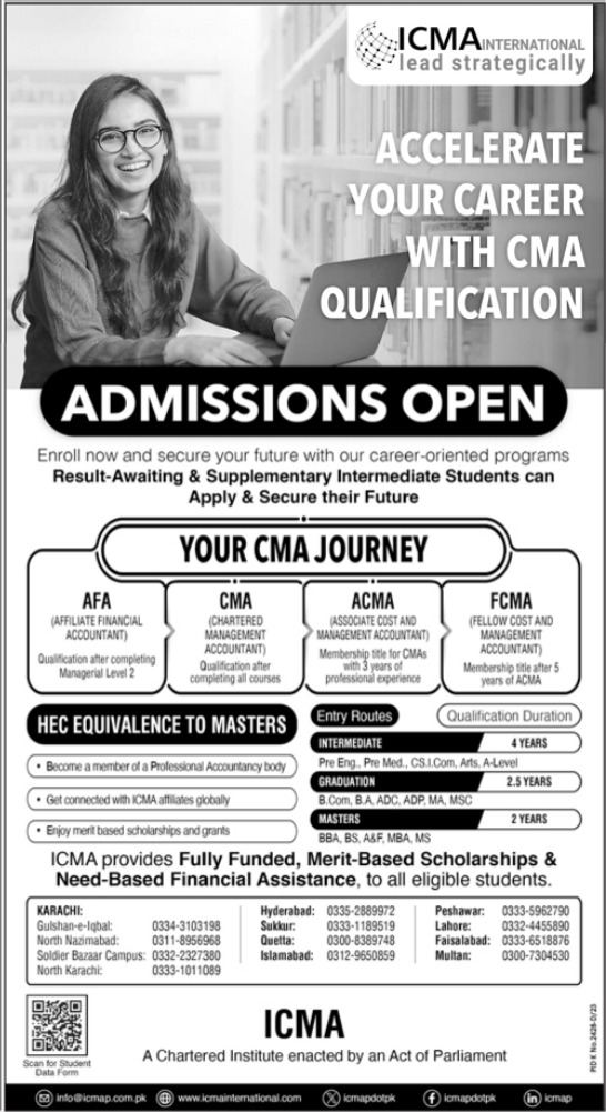 Institute of Cost and Management Accountants of Pakistan ICMAP has announced admissions 2024 for Affiliate Financial Accountant AFA, Chartered Management Accountant CMA, Associate Cost and Management Accountant ACMA, Fellow Cost and Management Accountant FCMA. Students who want to take admissions in Institute of Cost and Management Accountants of Pakistan ICMAP Karachi Sukkur, , Multan, Quetta, Faisalabad, Islamabad, Hyderabad, Lahore and Peshawar Sindh Pakistan for academic year 2024 to continue education in Science University can apply. Eligible candidates for admissions in CA, ACCA, Master and Bachelor can apply as per Government institute criteria and before closing date 3 April 2024 after reading advertisement online. Read newspaper ad for exact details.