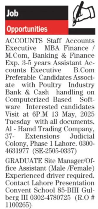 Private Company invites applications for job positions advertised in daily The News dated 13 May 2025 for following vacancies in Judicial Colony Phase 1 Lahore, lahore Punjab Pakistan.