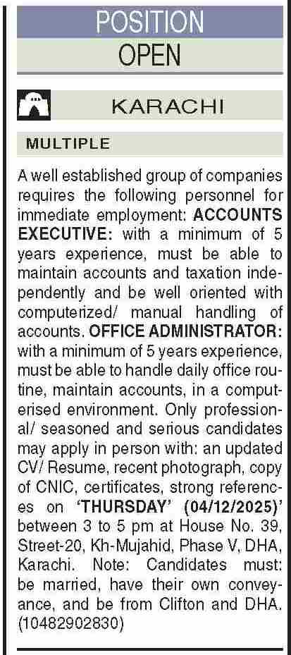 Private Company is looking for candidates for following posts as per job advertisement published in daily Dawn Newspaper of December 4, 2025 for location DHA Phase 5 Karachi, karachi Sindh Pakistan: