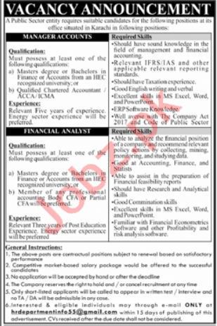 Public Sector Organization jobs advertisement dated about 11 September 2022 in daily Jang Newspaper invites application for the vacant post of accounts manager and finance analyst in Karachi, karachi Sindh Pakistan. Others, Bachelor, Master, ACCA and CA etc. educational qualification will be preferred.
