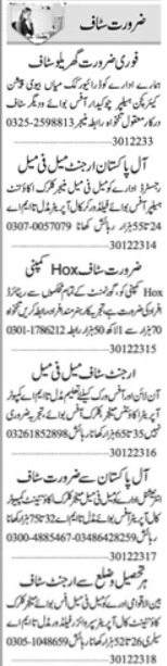 Private Company jobs advertisement dated about 30 December 2023 in daily Dunya Newspaper invites application for the vacant post of field worker, call operator, computer call operator, supervisor, computer operator, kitchen helper, accountant, chowkidar, accounts manager, manager, retired staff, patient care, driver, cook, clerk, office boy and helper in Islamabad, islamabad Islamabad Pakistan. Preferred Education is Bachelor, Master, Middle, Intermediate and Matric etc.