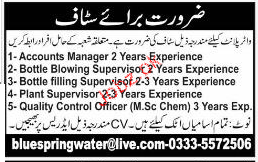 Accounts Manager, Bottle Blowing Supervisors Wanted