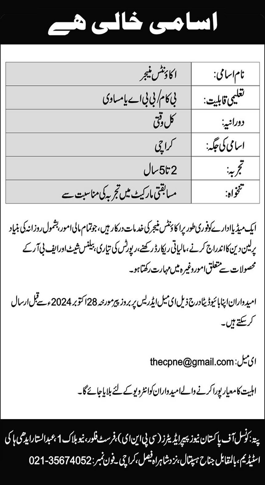 Latest Private jobs in Media Organization in Accounting and others can be applied till 28 October 2024 or as per closing date in newspaper ad. Read complete ad online to know how to apply on latest Media Organization job opportunities.