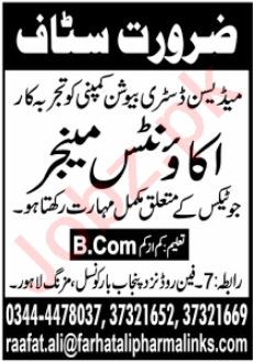 Distribution Company jobs advertisement dated about 17 December 2023 in daily Jang Newspaper invites application for the vacant post of accounts manager in Lahore, lahore Punjab Pakistan. Persons with B.com etc. education can apply.