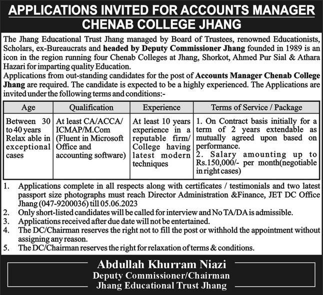 Vacant posts including accounts manager are announced in Chenab Colleges Jhang Jhang, jhang Punjab Pakistan as per 23 May 2023 advertisement in daily Jang Newspaper. Preferred Education is ACCA, CA, M.com and Master etc.