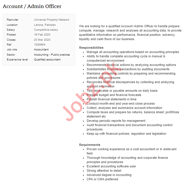 Latest Universal Property Network Accounting Posts Lahore 2025