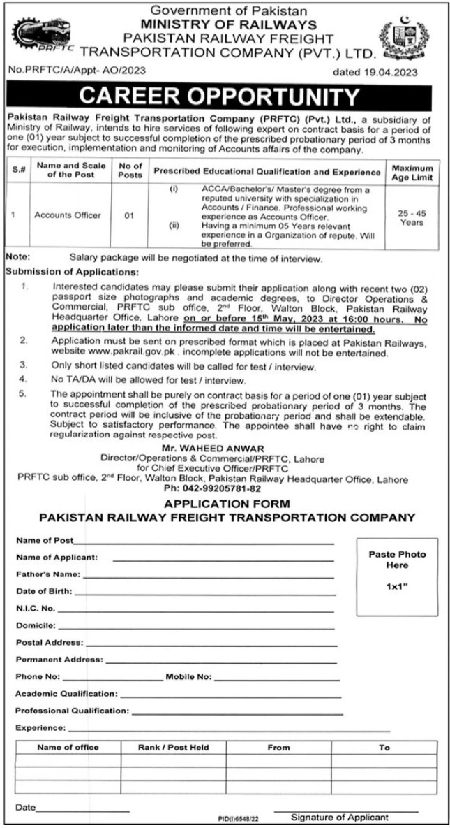 Pakistan Railway Freight Transportation Company PRFTC, Ministry of Railways is looking for candidates for following posts as per job advertisement published in daily The News Newspaper of April 22, 2023 for location Lahore, lahore Punjab Pakistan: