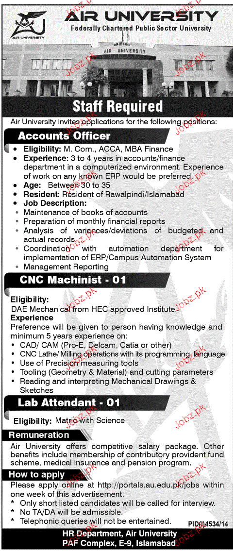 Apply as per details in job advertisement. Login to view further details of how to apply via https://www.jobz.pk online.
