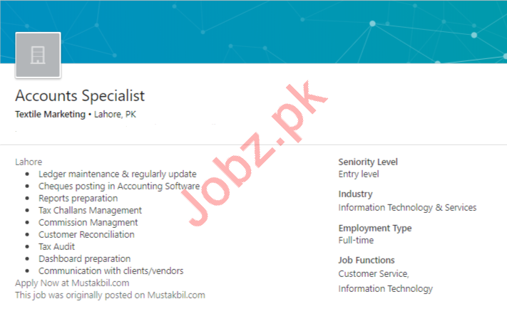 Latest Textile Marketing Company Accounting Posts Lahore 2025