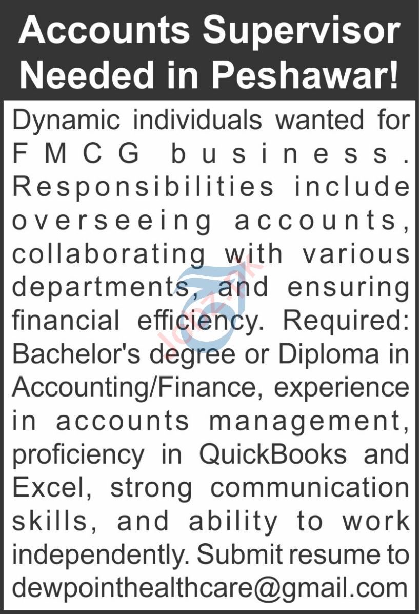 FMCG Company jobs advertisement dated about 10 March 2024 in daily Aaj Newspaper invites application for the vacant post of accounts supervisor in Peshawar, peshawar Khyber Pakhtunkhwa KPK Pakistan. Candidates with Others and Bachelor etc. educational background will be preferred.
