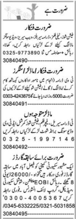 Vacant posts including actor, fauji guard, security guard and model are announced in Private Faisalabad, faisalabad Punjab Pakistan as per 12 January 2023 advertisement in daily Express Newspaper. Persons with Middle, Bachelor, Intermediate and Matric etc. education can apply.