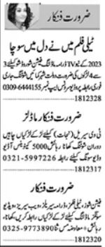 Media Sector jobs advertisement dated about 18 January 2023 in daily Dunya Newspaper invites application for the vacant post of singer, model and actor in Lahore, lahore Punjab Pakistan. Preferred Education is Intermediate, Matric and Middle etc.