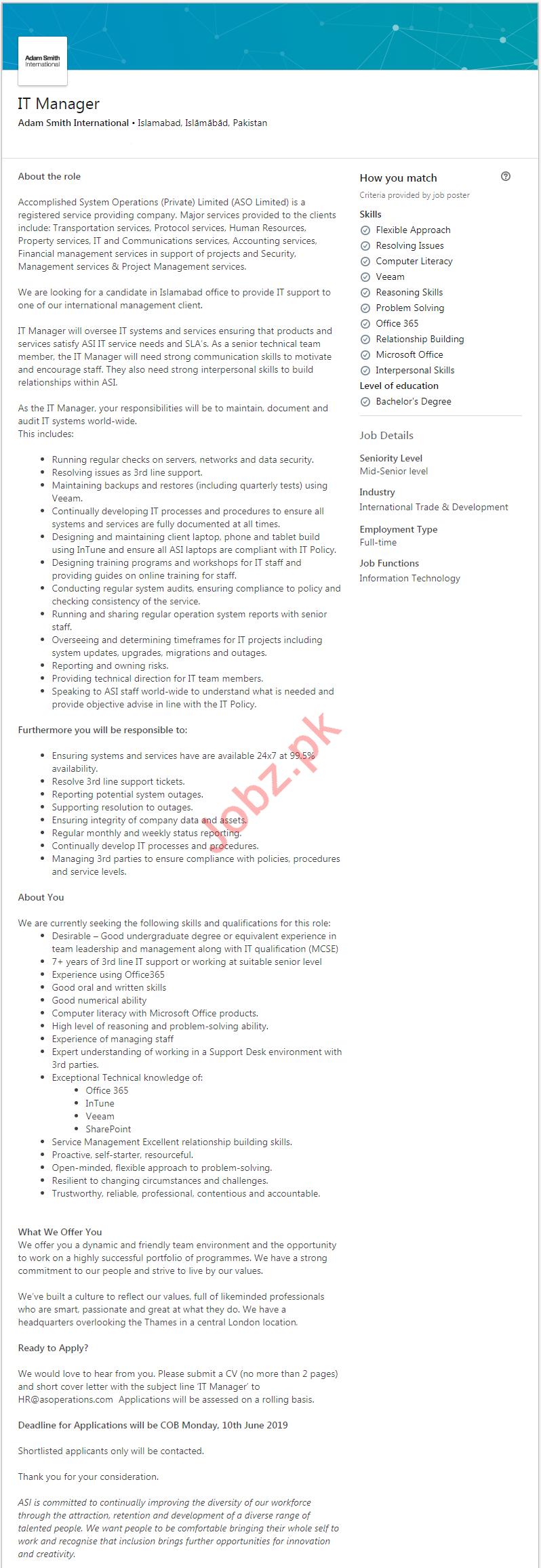 Adam Smith International Islamabad Jobs 2019 for IT Manager