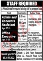 Private Company jobs advertisement dated about 20 November 2022 in daily Jang Newspaper invites application for the vacant post of admin assitsnt, office execeutive and accounts assistant in Islamabad, islamabad Islamabad Pakistan. Educational qualifications required MA, MBA, M.com, B.com, Master, M.sc and Bachelor etc.
