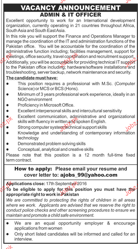 Apply as per details in job advertisement. Login to view further details of how to apply via https://www.jobz.pk online.