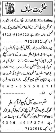 Private Lahore, lahore Punjab Pakistan invites applications from eligible candidates for the post of reporter, helper, general duty assistant, admin assistant, computer hardware technician, rider, property marketing staff, survey assistant, data entry operator, office boy, male computer operator and videographer as per advertisement of February 13, 2023 published in daily Jang Newspaper. Persons with Bachelor, Middle and Intermediate etc. education can apply.