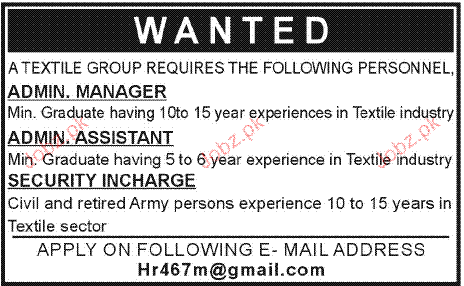 Admin Manager, Admin Assistant and Security Incharge Wanted