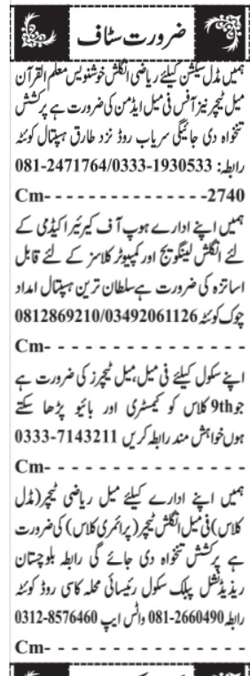 Private School is looking for candidates for following posts as per job advertisement published in daily Jang Newspaper of August 5, 2023 for location Quetta, quetta Balochistan Pakistan: