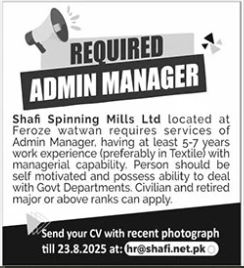 Shafi Spinning Mills Limited latest Private Management jobs and others can be applied till August 23, 2025 or as per closing date in newspaper ad. Read complete ad online to know how to apply on latest Shafi Spinning Mills Limited job opportunities.