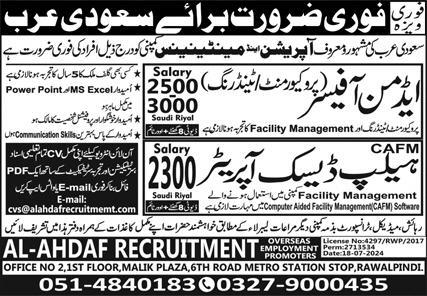 Al Ahdaf Recruitment Overseas Employment Promoters invites applications for job positions advertised in daily Express dated 23 September 2024 for following vacancies in Saudi Arabia, saudi arabia Saudi Arabia.