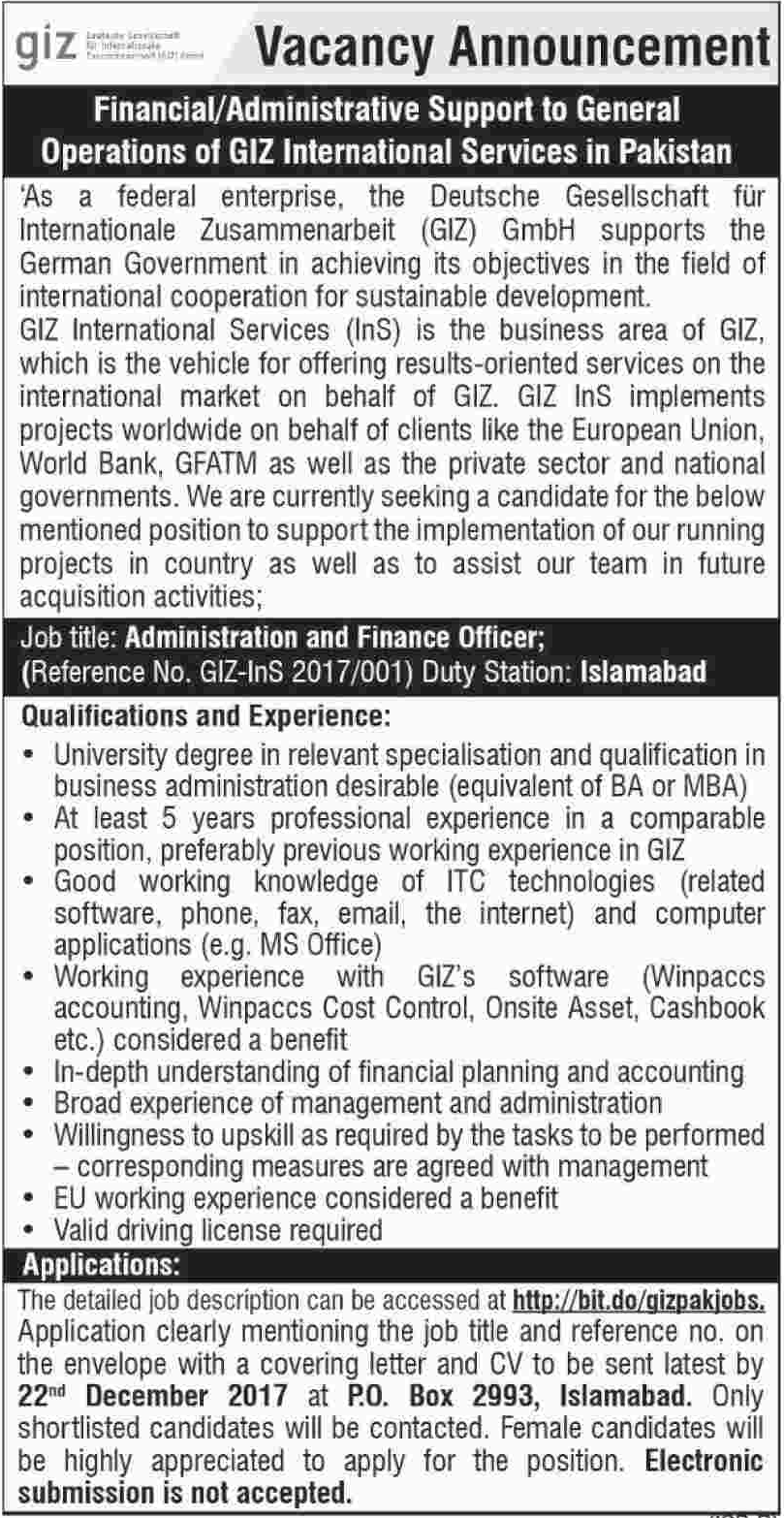Administration & Finance Officer Jobs in GIZ Pakistan