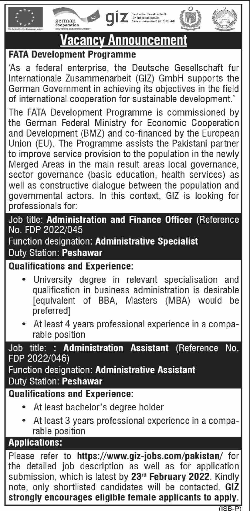 GIZ Pakistan Peshawar Khyber Pakhtunkhwa KPK Pakistan invites applications from eligible candidates for the post of Administrative Specialist, Administration Officer and Finance Officer as per advertisement of February 10, 2022 published in daily Dawn Newspaper. Persons with BBA and MBA etc. education can apply.