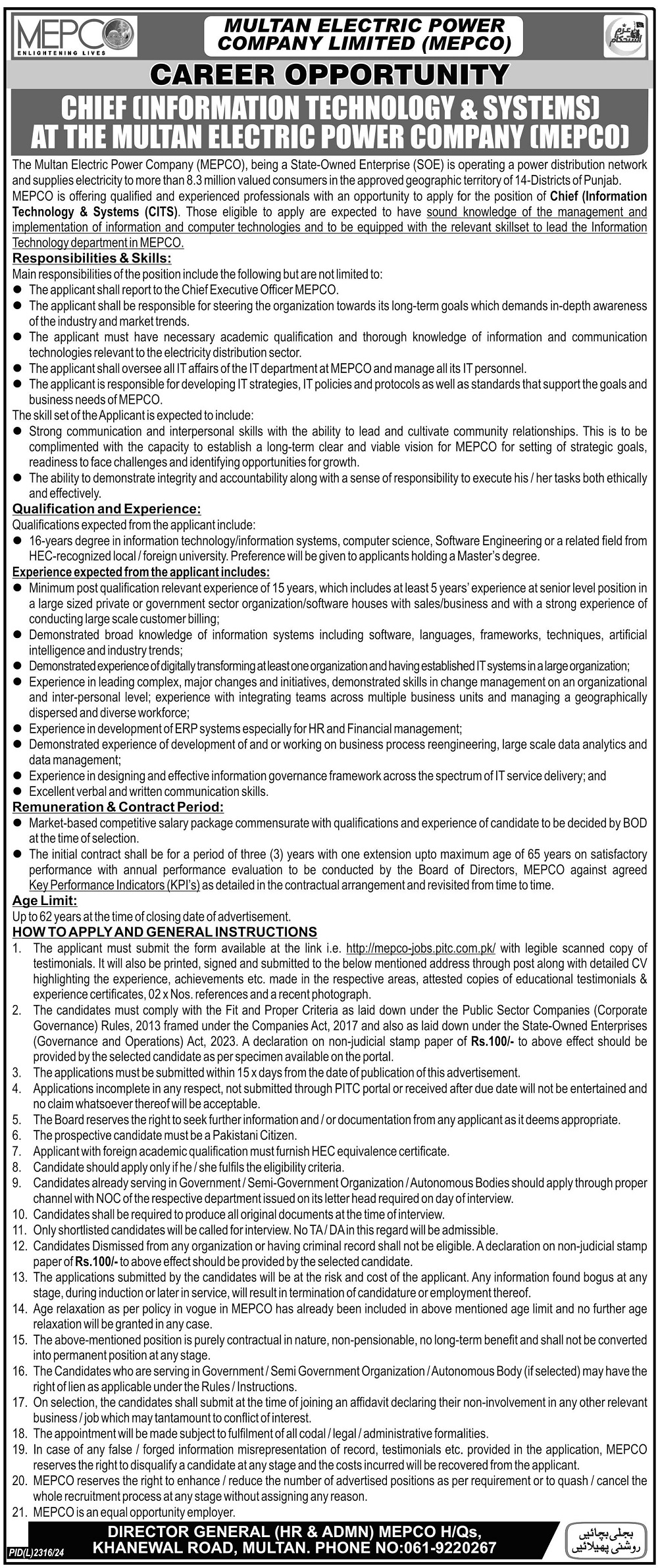 Multan Electric Power Company MEPCO Khanewal Road Multan, multan Punjab Pakistan invites applications from eligible candidates for the post of chief information technology systems as per advertisement of February 16, 2025 published in daily Express Tribune Newspaper. Candidates with Master and Bachelor etc. educational background will be preferred.