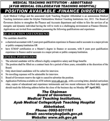 Latest Government jobs in Ayub Medical College in Finance and others can be applied till 18 April 2022 or as per closing date in newspaper ad. Read complete ad online to know how to apply on latest Ayub Medical College job opportunities.