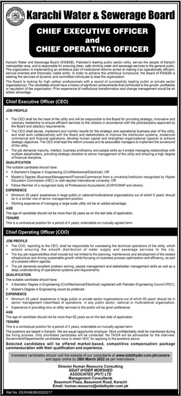 Karachi Water & Sewerage Board Karachi, karachi Sindh Pakistan invites applications from eligible candidates for the post of chief executive officer ceo and chief operating officer coo as per advertisement of March 13, 2022 published in daily Jang Newspaper. Candidates with B.E and Master etc. educational background will be preferred.