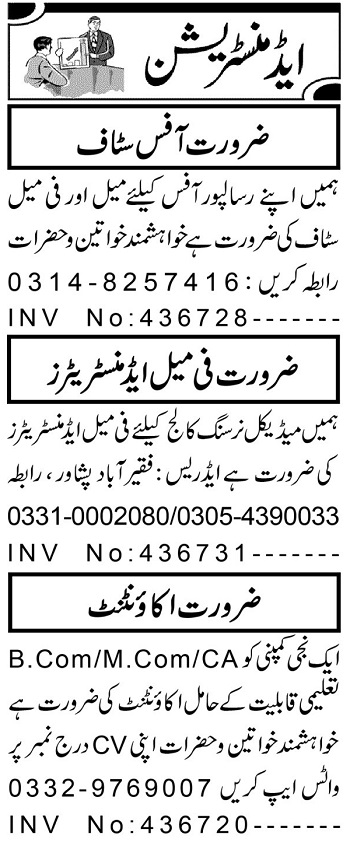Private Company Peshawar, peshawar Khyber Pakhtunkhwa KPK Pakistan invites applications from eligible candidates for the post of accountant, office staff and female administrator as per advertisement of November 19, 2024 published in daily Aaj Newspaper. Persons with B.com, Master, Bachelor, CA and M.com etc. education can apply.