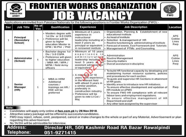 Latest Frontier Works Organization FWO Management Posts Rawalpindi 2025