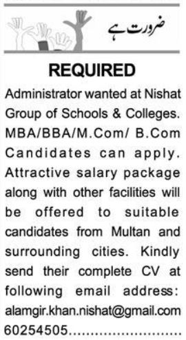 Nishat Group of Schools and Colleges jobs advertisement dated about 31 May 2025 in daily Express Newspaper invites application for the vacant post of administrator in Lodhi Colony Multan, multan Punjab Pakistan. Preferred Education is B.com, BBA, MBA and M.com etc.